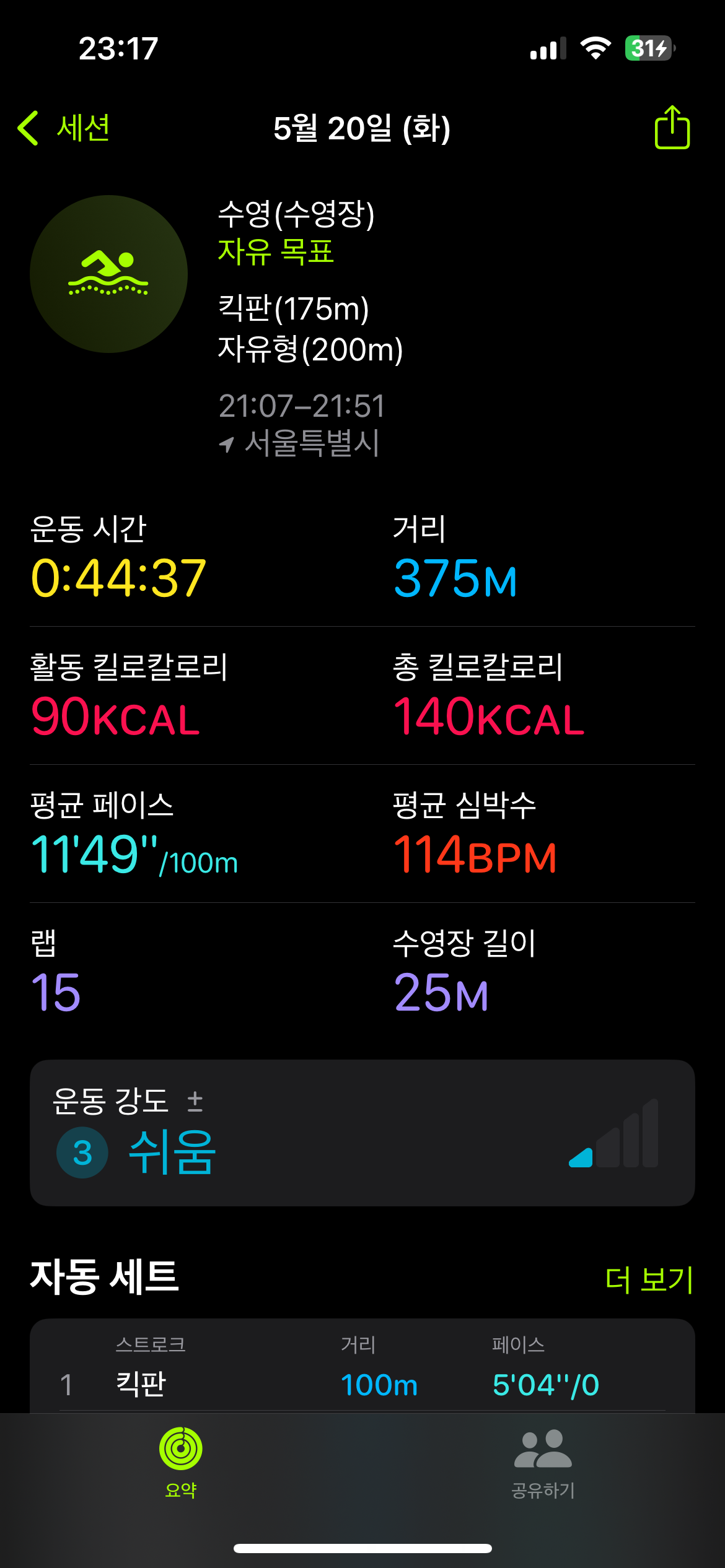 워밍업인 킥판 발차기를 덜 하고 싶어서 좀 늦은 시간에 집에서 나섰고