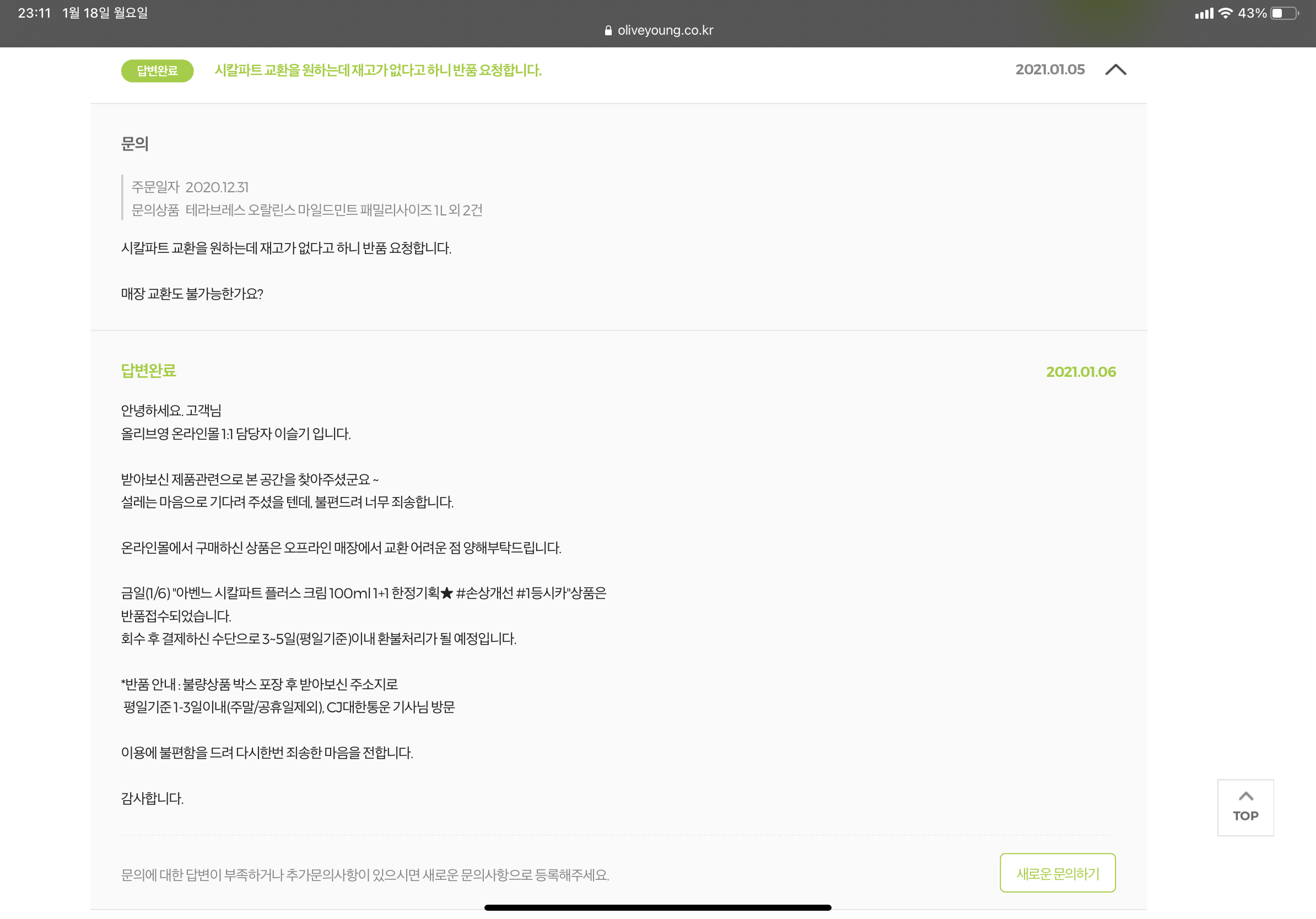 반품 접수를 하며 또 물어봤다. 매장 교환이 안 되는지?
