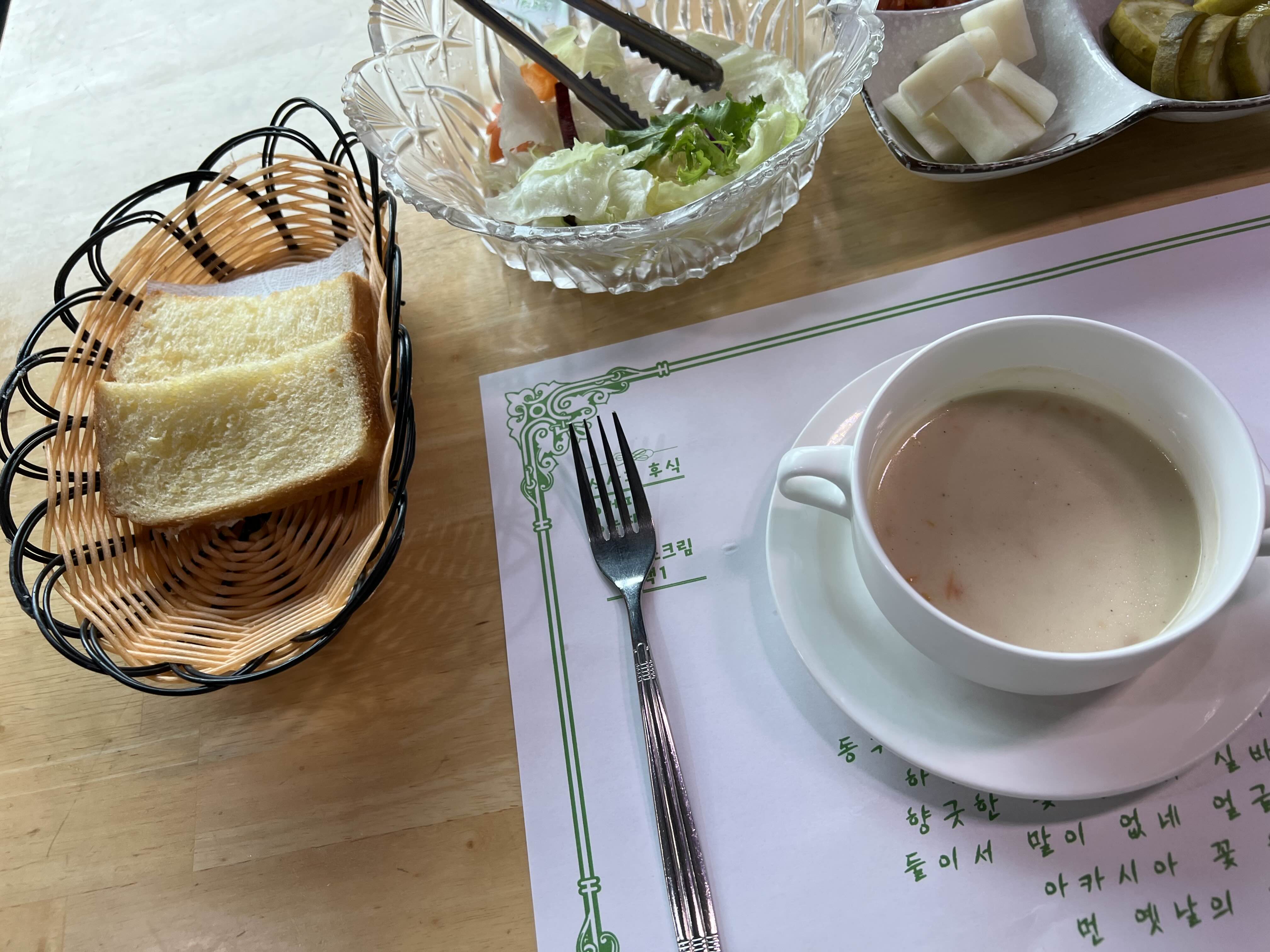 요기는 샐러드, 수프, 식전 빵이 나옵니다