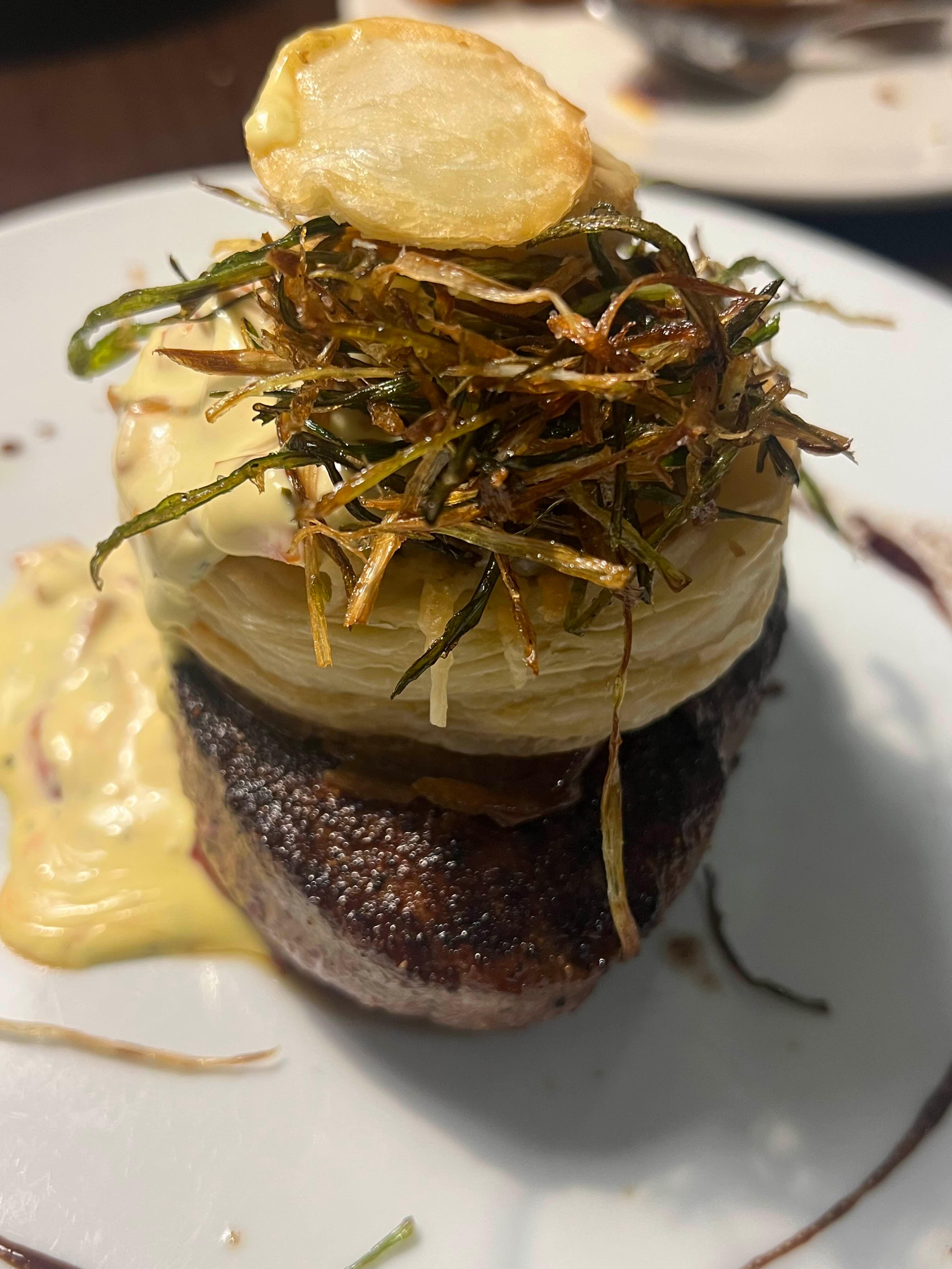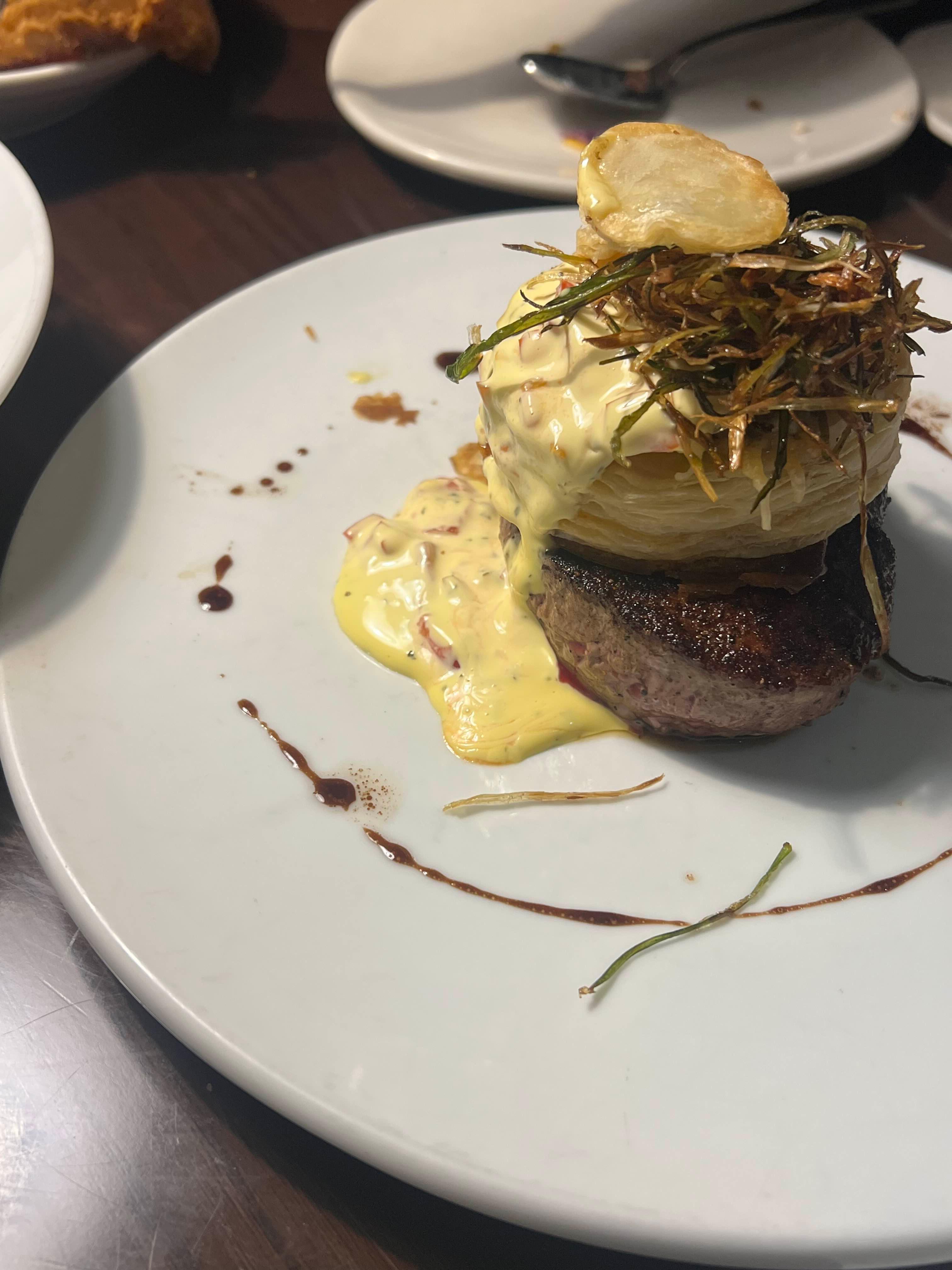 안심 스테이크 위에 머쉬룸 스프레드로 속을 채운 페이스트리를 올려 바삭함과 부드러움을 동시에 즐길 수 있는 스테이크
