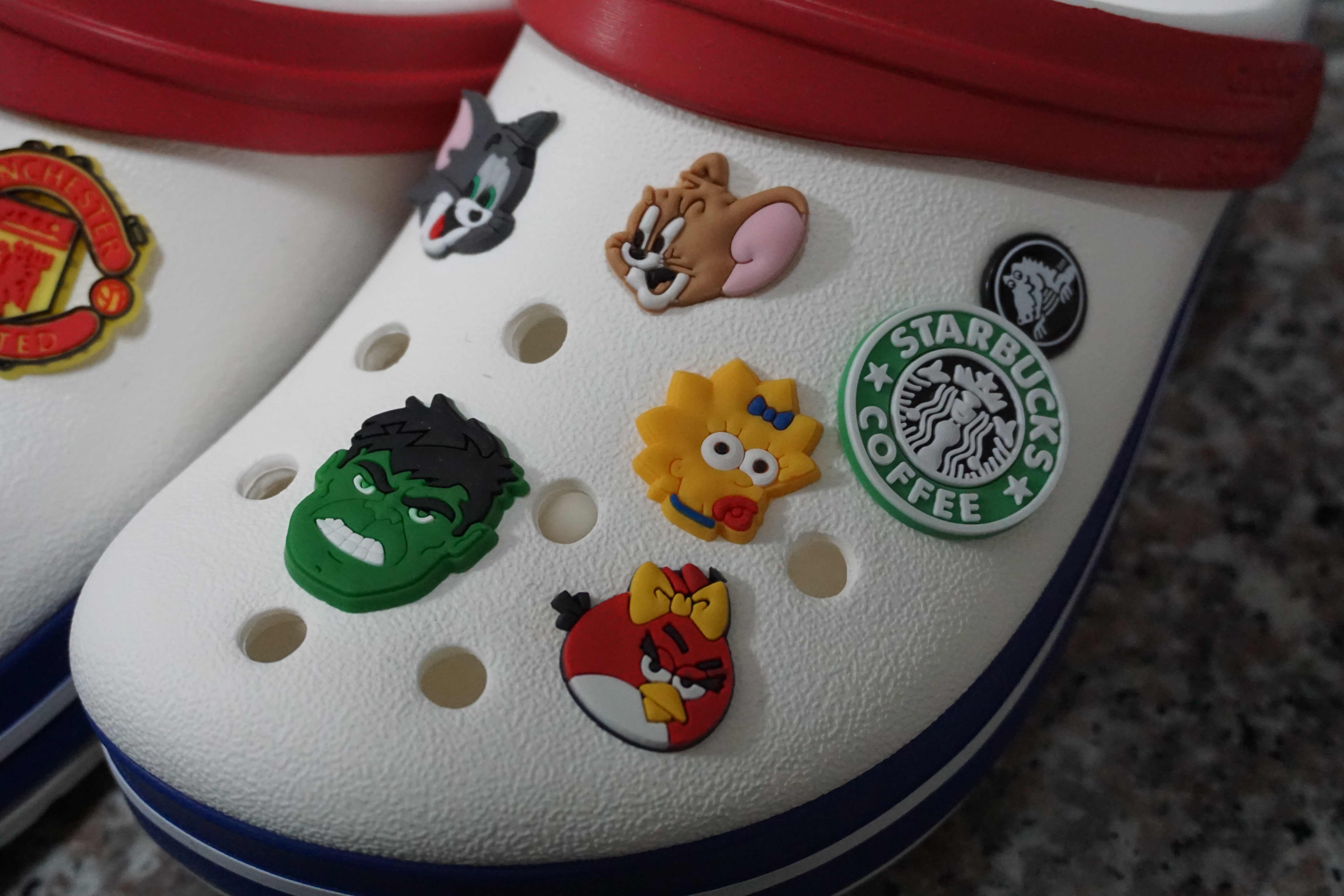 빨간색과 파란색이 곁들여져 있는.. 흰색의 크록스 발견