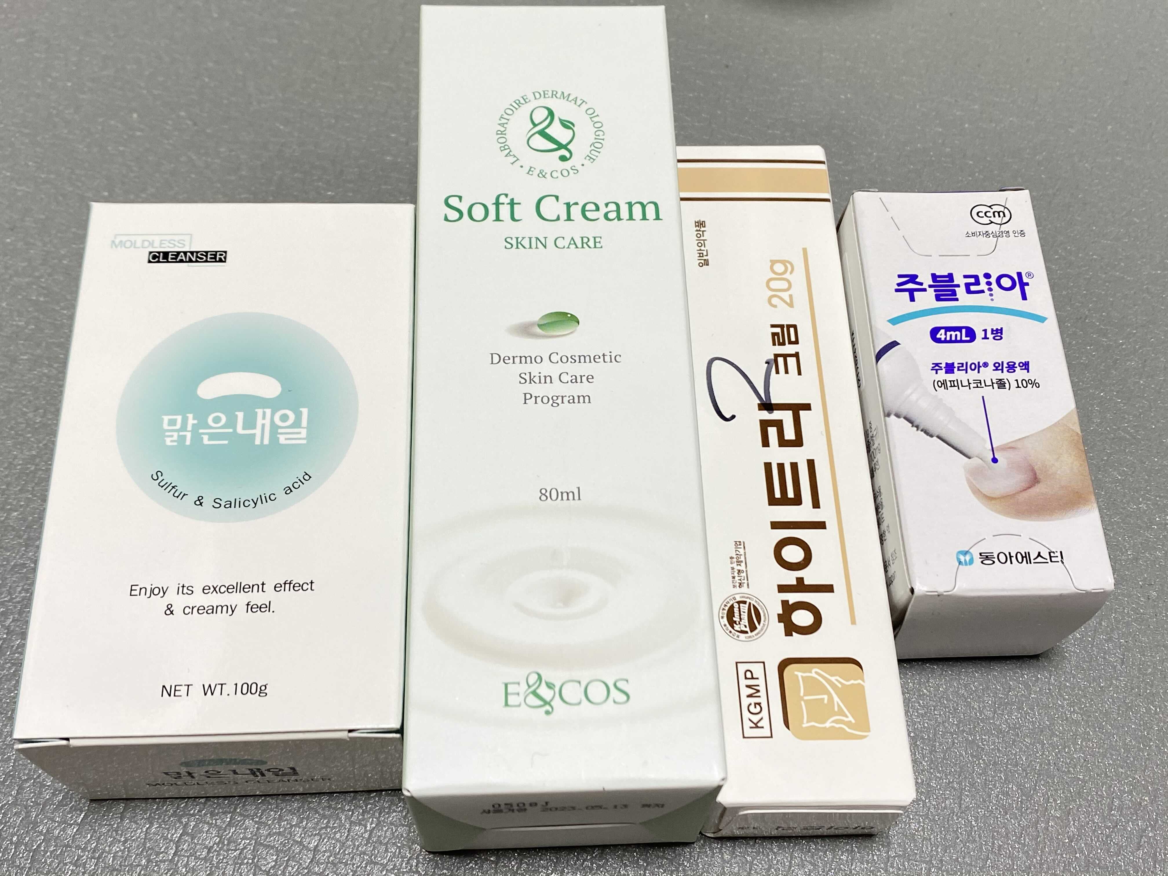 진균 비누, 각질 부드럽게 하는 크림, 치료 목적인 연고, 발톱 치료 목적인 용액