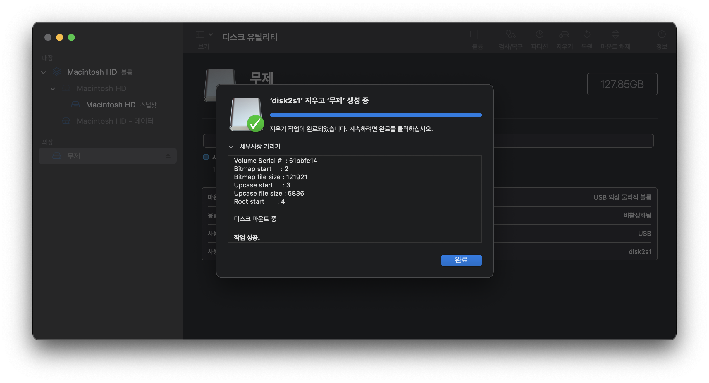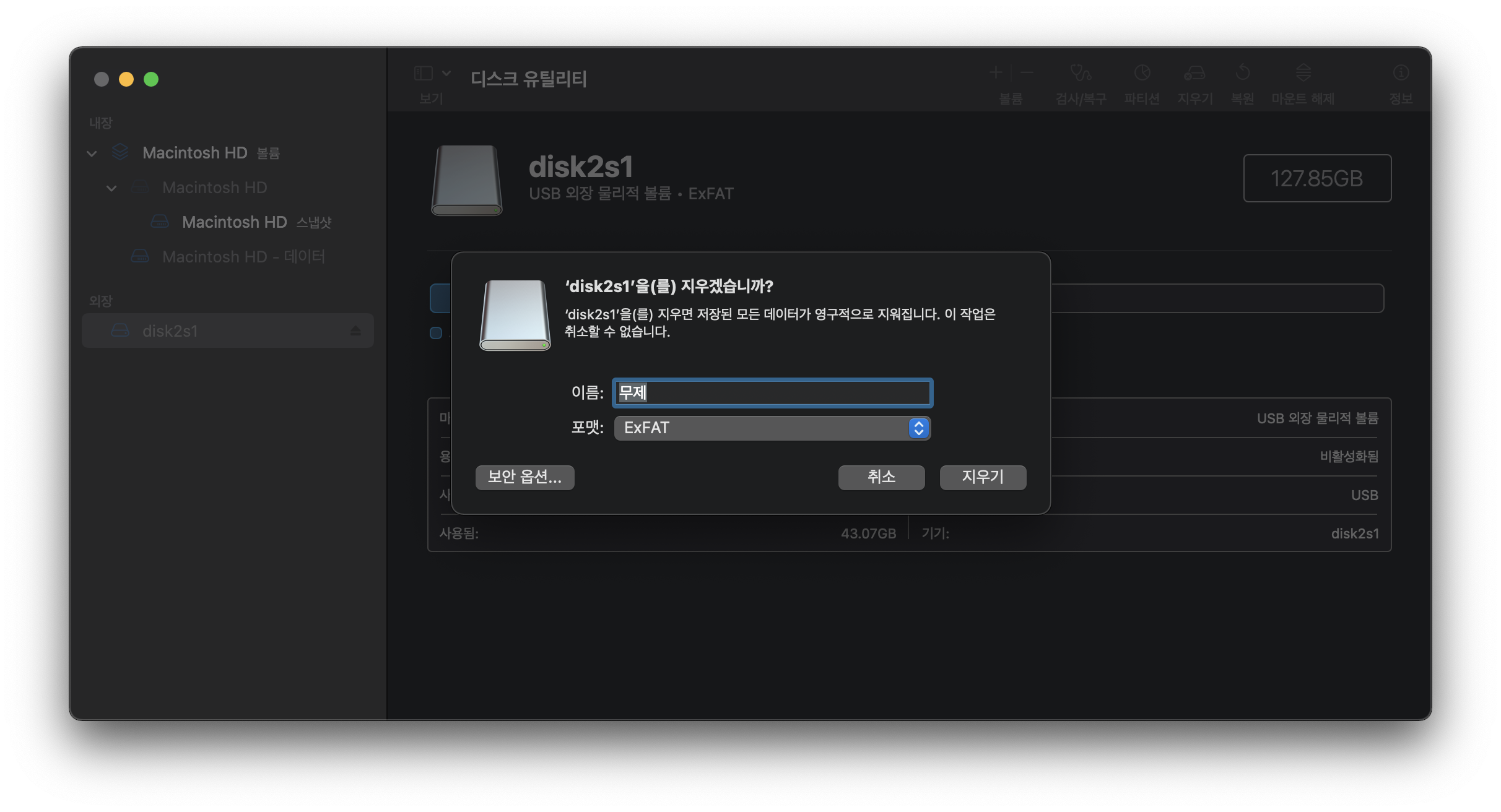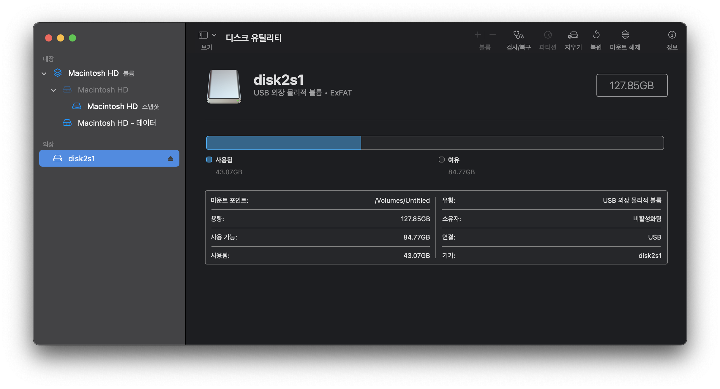 이름은 왜 이렇게 되어있는지 모르겠는데 disk2s1로 되어있음